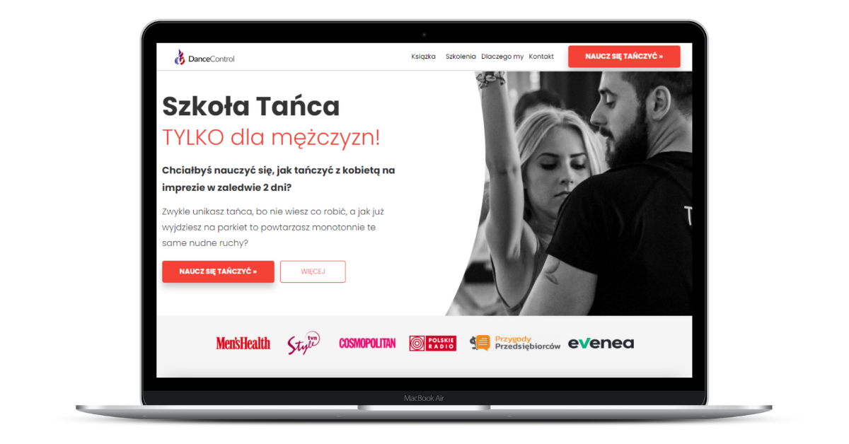 Zapraszamy do zapoznania się z historią sukcesu jednego z naszych klientów – warszawskiej szkoły tańca Dance Control. Co jest w tym case study wyjątkowego? Zdecydowanie więcej, niż 1 rzecz! Na wstępie: Dance Control swoje usługi dedykuje wyłącznie… mężczyznom, gwarantując ogromny postęp w umiejętnościach tanecznych w ciągu 2 dni (tak, tylko 2 dni szkolenia!). Powoduje to automatyczne zawężenie grupy odbiorców o kobiety. Dodatkowo, większość odbiorców to single – co powoduje, że grupa docelowa jeszcze bardziej się “kurczy”. Początkowo, studio działało wyłącznie stacjonarnie, prowadząc kursy tylko w weekendy – to kolejny aspekt, który pozornie utrudnia sprzedaż (dojazdy, noclegi itd). Mimo to, dzięki przemyślanej strategii, kursy sprzedawały się rewelacyjnie.