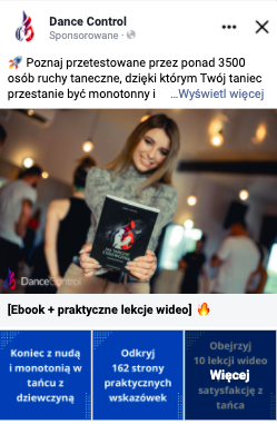 Przykład reklamy wykorzystanej w systemie Facebook Ads, w formie karuzeli. Reklamy promujące e-booka wraz z bonusem były kierowane między innymi do “zimnego odbiorcy”, czyli osób, które dotychczas nie miały styczności ze szkołą Dance Control. Dzięki kierowaniu przekazów reklamowych do tej grupy, osoby, które zainteresują się nauką tańca klikną w reklamę lub zakupią e-book, dołączając jednocześnie do bazy remarketingowej. Poznają próbkę możliwości, dzięki czemu z większym zaufaniem sprawdzą kolejne opcje.