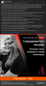 Dance Control posiada również dedykowaną grupę na Facebooku, do której każdy może dołączyć, zadać pytanie czy pokazać efekty. Kilka razy w roku prowadzone są bezpłatne webinary (bezpłatne szkolenia internetowe). Oba te narzędzia służą jako dodatkowy kanał sprzedaży kursu „Praktyk tańca” i rewelacyjnie budują relacje z potencjalnymi klientami.