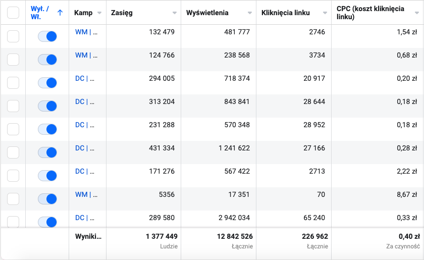 kampanie, dzięki którym reklamy stale widzieli coraz to nowi odbiorcy, odwiedzając dzięki temu stronę internetową – dzięki temu mogliśmy stale realizować kampanie remarketingowe, nazywane też “śledzącymi” czy “powracającymi”;