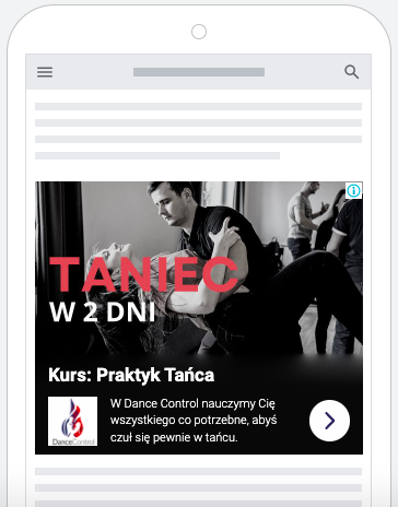Przykład reklamy promującej kurs stacjonarny „Praktyk tańca” wykorzystany w systemie Google Ads.
