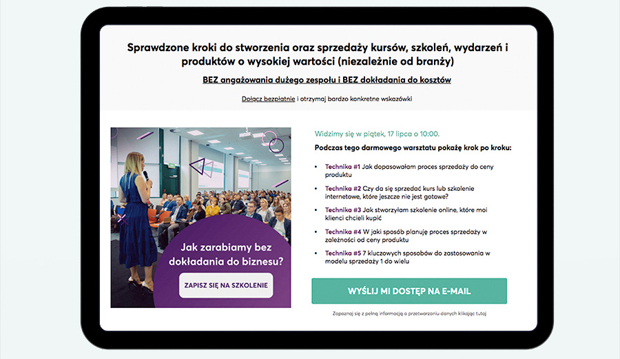 Przemyślana strategia – webinar sprzedażowy kursu odbywa się co tydzień. Cztery dni przed webinarem odbywa się kampania webinarowa. Zaraz po webinarze uruchamiana jest kampania promująca tylko i wyłącznie sprzedaż kursu. Kampania sprzedażowa kierowana jest do osób, które wzięły udział w webinarze i ma na celu ich „dogrzanie”, czyli nakłonienie do zakupu oraz przypomnienie o produkcie.