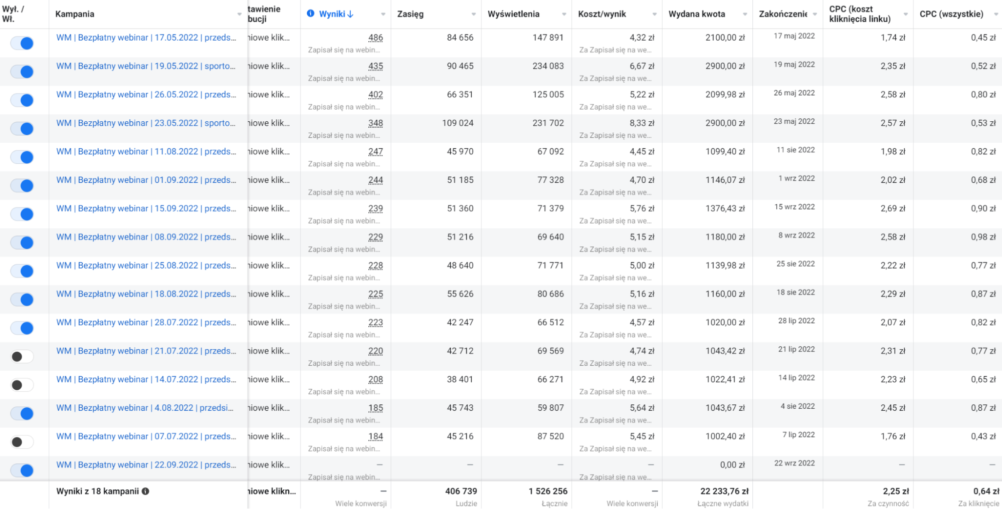 Wykres przedstawia wyniki kampanii webinarowych w systemie Facebook Ads od maja do lipca bieżącego roku. Tabela przedstawia tylko część wskaźników, czyli: wyniki – ilość zapisów na dany webinar, ile osób widziało reklamy (zasięg), ile razy je widzieli (wyświetlenia), ile średnio kosztował zapis na webinar, jaki budżet został przeznaczony na całą kampanię, CPC – czyli jaki był koszt kliknięcia linku z reklamy (czyli na stronę zapisów).