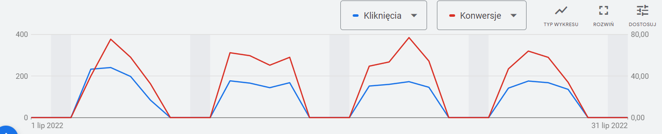 Wykres przedstawiający wyniki uzyskane w lipcu 2022 w systemie reklamowym Google Ads. Niebieski wykres przedstawia ilość kliknięć (skala po lewej stronie), natomiast czerwony wykres odpowiada konwersjom – czyli w tym przypadku ilości zapisów na webinar (skala po prawej stronie).