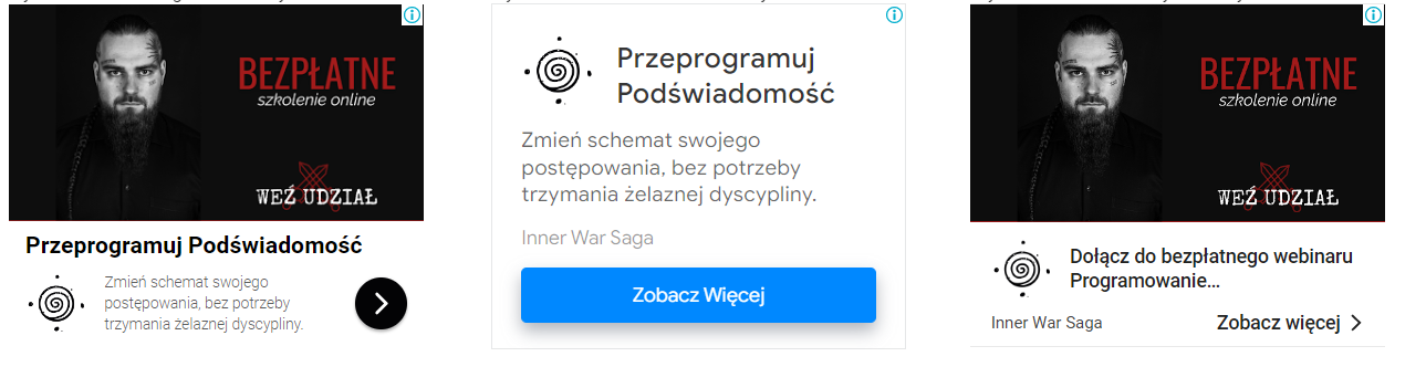 Odpowiednio dobrane grupy odbiorców – dzięki wcześniej opisanym testom A/B udało nam się dotrzeć do dwóch grup, które okazały się być strzałem w 10. Pierwszą z nich są tzw. lookalike, czyli odbiorcy dobrani na podstawie osób, które wcześniej skorzystały z oferty Inner War Saga. Drugą grupą są odbiorcy dobrani na podstawie zainteresowań (medytacja, Personal development, Runy, samoświadomość, Inteligencja emocjonalna itp.)