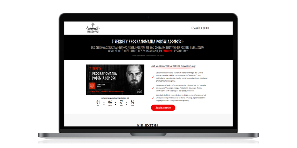 Strona lądowania (ang. landing page) dedykowana wyłącznie sprzedaży kursu “Programowanie Podświadomości”. Zwróć uwagę na to, że strona i materiały reklamowe są ze sobą spójne – zarówno stylem jak i kolorystycznie. Dbanie o to, aby identyfikacja wizualna marki była spójna na każdej jej stronie internetowej oraz w materiałach graficznych prowadzi do zwiększenia rozpoznawalności marki.